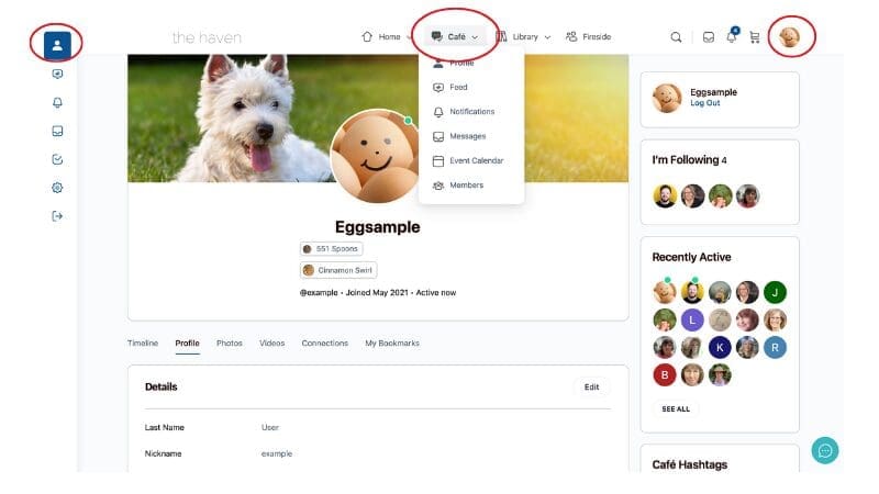 Your profile is accessible through the main menu Café Tab, the avatar menu, and the left sidebar menu.