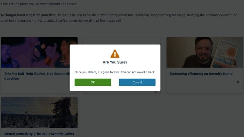 You will see this warning message. I can’t change its wording, or else I would make it less threatening. Don’t worry, it’s not gone forever, and you can re-save a post if you find it again and tap the button.