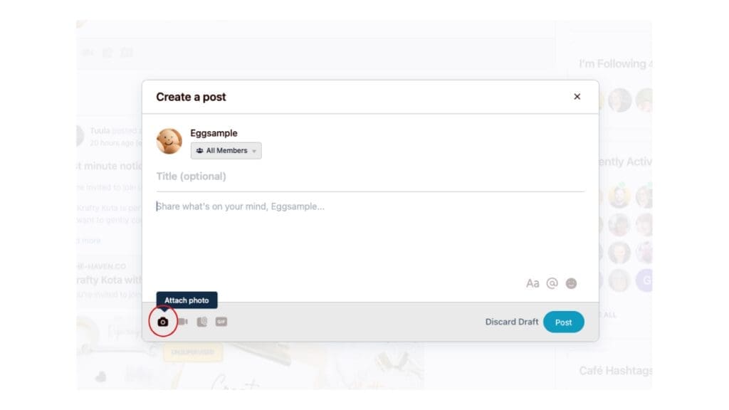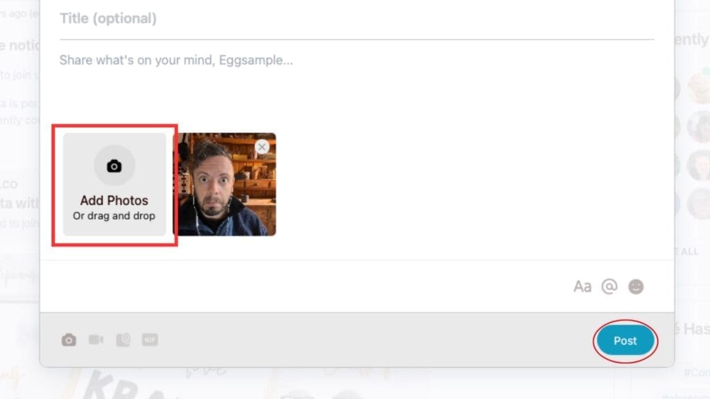 You will see a camera icon with a progress ring while the image is uploading. The “Post” button is pale and unclickable until the upload is complete. When it’s ready, the icon will disappear and the Post button will become functional.