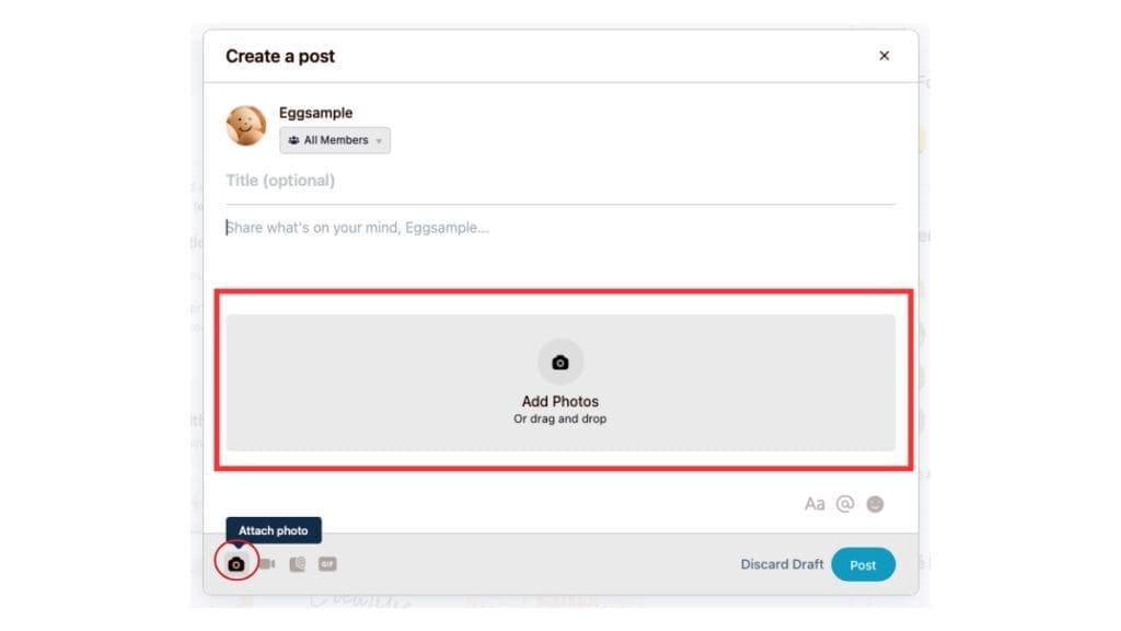 When you post to the Activity Feed, you will see an option to upload media (photos, videos, documents, and gifs).