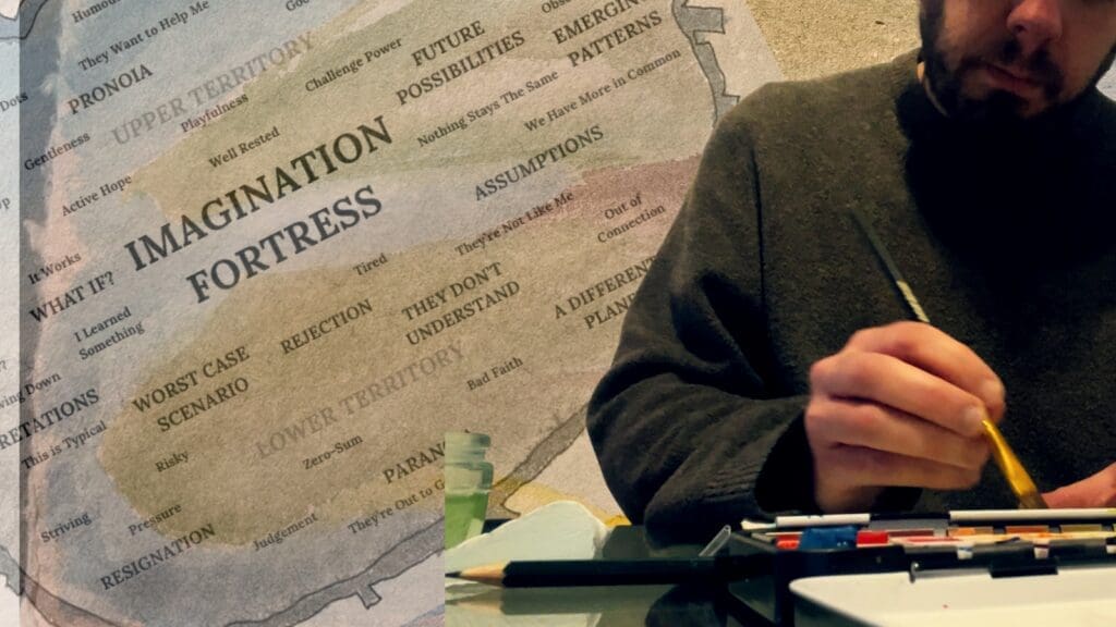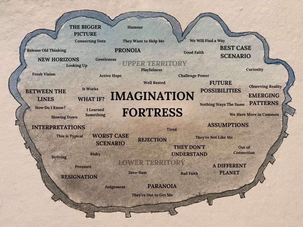 Between this and the lower terrain lay a connecting middle ground dominated by what I called the Imagination Fortress. A neutral zone where our interpretations, reading between the lines, and what-ifs can either open up possibilities or slide into catastrophising.